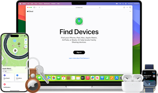 เข้าสู่เว็บไซต์ FIND DEVICES > ลงชื่อเข้าใช้ (SIGN IN) ด้วย APPLE ID ของอุปกรณ์ที่สูญหาย > เลือกอุปกรณ์หรือสิ่งของที่ต้องการค้นหา > กดส่งเสียงดัง หรือเส้นทางเพื่อนำทางไปหาอุปกรณ์ที่สูญหาย